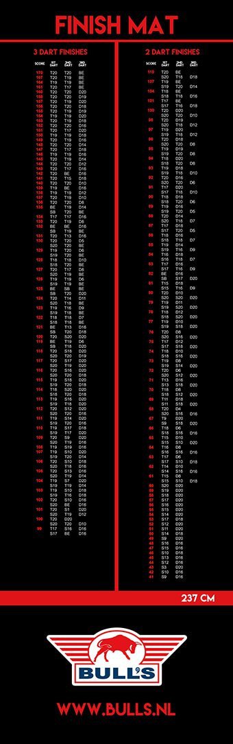 Op de dartmat staan alle meest gebruikelijke uitgooicombinaties, zodat jij in een oogopslag ziet hoe jij jouw leg binnenhaalt.