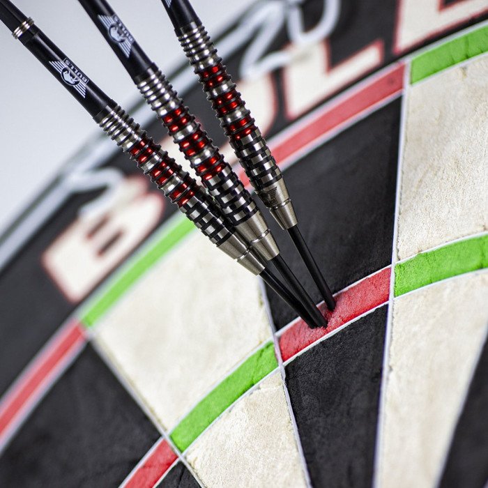 De Bull's Smoke Red Flare darts worden geleverd met Bull's Smoke flights en zwarte nylon shafts, die het dynamische design compleet maken en zorgen voor een stabiele vlucht.